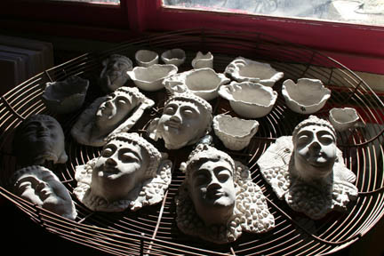 Here is the latest greenware coming out of the bag of clay. I’ve started making some of the buddha heads into wall-pockets. Flowers go nicely in the head, crowning the buddha with a floral array. Also new are the buddha bowls…alot to do, and I need to pack and move…