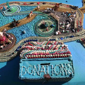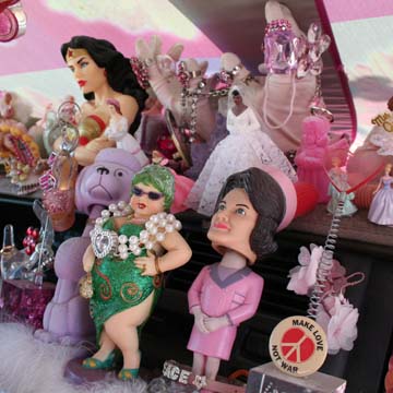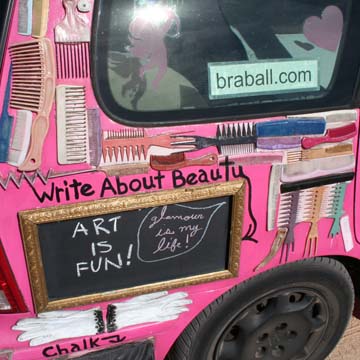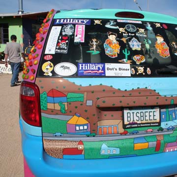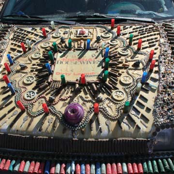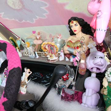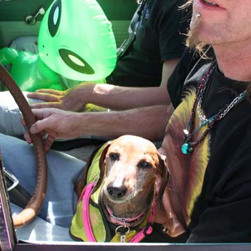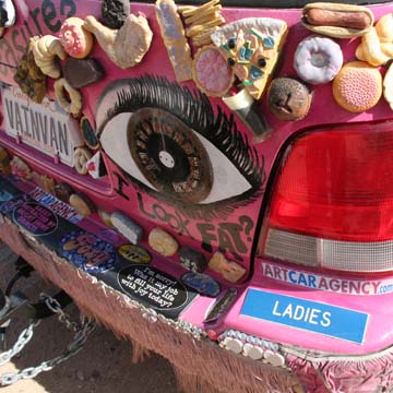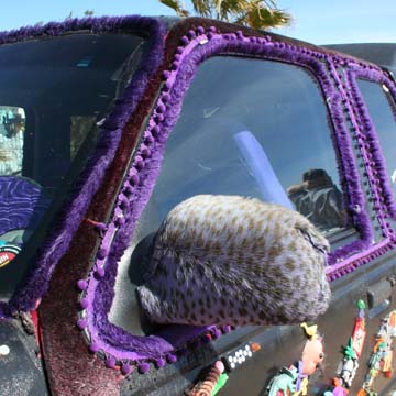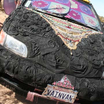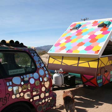 Soooo the following day after the big gala at Fi-Lox-See, Bonnie Kopp of True World Gallery in Joshua Tree, brought a fleet of art cars to my abode in Wonder Valley. What a treat !!! I did not get everybody’s names. Kate Pearson was from Bisbee. Joy Johnson from Berkeley (boots on top of car and manican heads upside down in the interior.Jensue and Rev Chili… Emily Duffy with the fabulous Vain Van… and Scott with the little alien bug and cute wiener dog.![]()