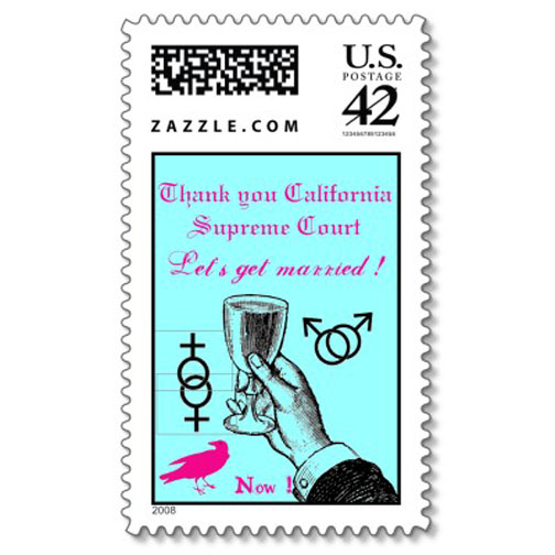 So, here’s the story. Besides planning to get married with my beautiful male lover of almost three years, I recently signed up with zazzle a company that puts your design on things like mugs and US postal stamps, t-shirts etc. Yesterday I designed a stamp commemorating the California Supreme Court decision to allow gay people to get married. The stamp was rejected by the US Postal system for their policy which reads: