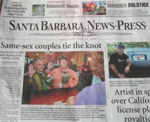 art, beautiful male, beauty, bml, buddha, california, compassion, equality, garden, gay, goddesses, hindu, india, marriage, ocean, peace, photo, politics, punjabi, queer, Santa Barbara, Uncategorized, world Front Page Santa Barbara News Press Posted by magentaraven on Wednesday, June 18, 2008Thursday, June 19, 2008 This morning our neighbor called over to us, to tell us she put our picture from the paper in our mailbox. Click the newspaper for a larger image. For more wedding pictures click this. Share this: Click to share on Facebook (Opens in new window) Facebook Click to share on X (Opens in new window) X Like Loading...
