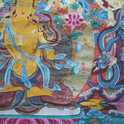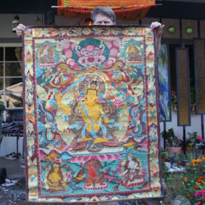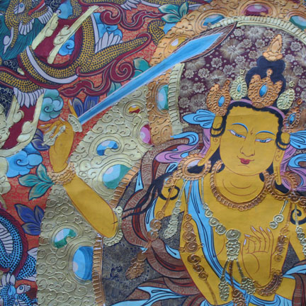 A wedding gift from Joseph and Larry in Sonoma.The thangka is from one of the six largest of the monasteries of the Gelukpa sect – the sect of the Dalai Lama. Manjushri:Manjushri (Tibetan: jam pal yang. English: The Glorious One with a Melodious Voice).The bodhisattva that represents the wisdom of all the buddhas of the ten directions and three times. Manjushri has one face and two hands held to the heart in the Dharma Teaching gesture (mudra) delicately holding the stems of two lotus flowers blossoming at each ear. The blossom on his right supports the flaming sword of wisdom and the left supports the Prajnaparamita Sutra. Very peaceful and smiling, he is adorned with a crown, jewel and gold ornaments and variously coloured silk garments, seated in vajra posture above a moon disc, multi-coloured lotus.