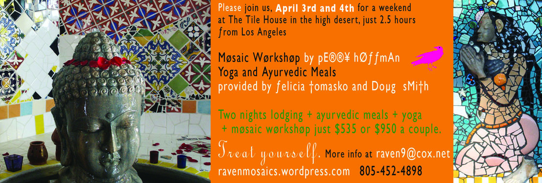 Please join us for an inspirational weekend on April 3rd and 4th at the Tile House in wOnder valley, California just 2.5 hours from Los Angeles, Vegas or San Diego. Perry Hoffman will be giving a mosaic workshop, starting the morning right with Felicia Tomasko teaching yoga classes and serving us Ayruvedic meals. Two nights lodging + ayruvedic meals + yoga + mosaic workshop for $535 or $950 a couple. TREAT YOURSELF… more information? email me at raven9@cox.net You can also just sign up for the mosaic workshop for $150.