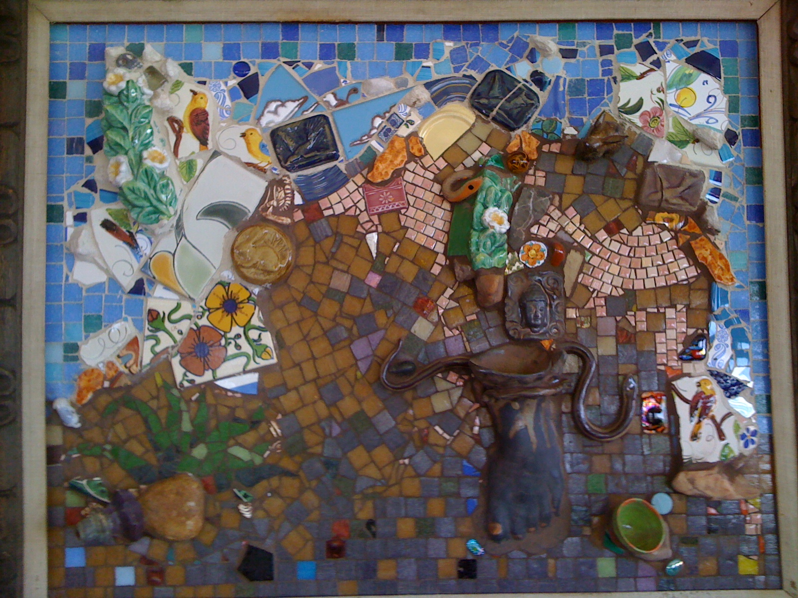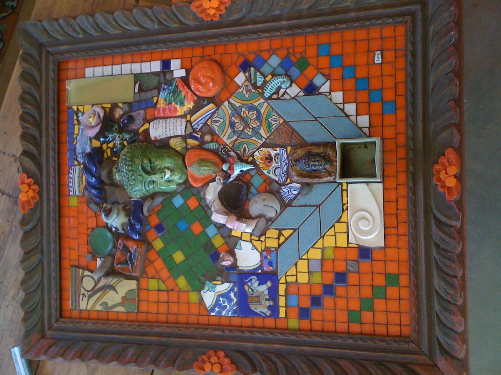 Three new mosaic pieces designed to burn incense and bring peace of mind and body as well as, bring magic and wonder, color and energy to your environment. Available at Wayward Home and Gardens ™ Appx. 20″x 30″ each. Materials include, smalti, Italian vintage glass, tile, ƒu∫ed gla∫∫ made by me in Utila, and handmade ceramic pieces, birds and buddhas…